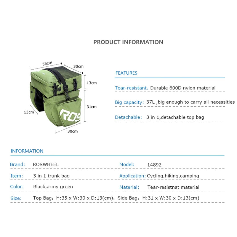 14892 14892SA SMountain Road Bicycle Bike 3 in 1 Trunk Bags Cycling Double Side Rear Rack Tail Seat Pannier Pack Luggage Carrier